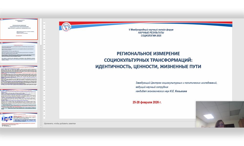 С 25 по 28 февраля 2026 года на базе Белгородского государственного национального исследовательского университета проходил V Международный научный онлайн-форум «Научные результаты социологии–2025». Мероприятие объединило исследователей для обсуждения актуальных работ, опубликованных в научной периодике текущего года. Работа форума была организована по ряду тематических направлений, включая социологию культуры и религии, образования, молодежи, управления, а также отдельную секцию для аспирантов и молодых ученых. Вологодский научный центр РАН представили сотрудники Центра социокультурных и политических исследований – в.н.с., зав. Центром к.э.н. Ксения Евгеньевна Косыгина и м.н.с. Ангелина Эдуардовна Жданова.
